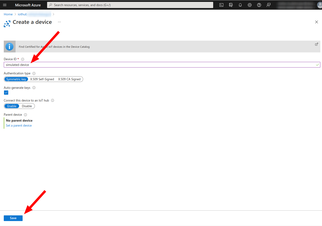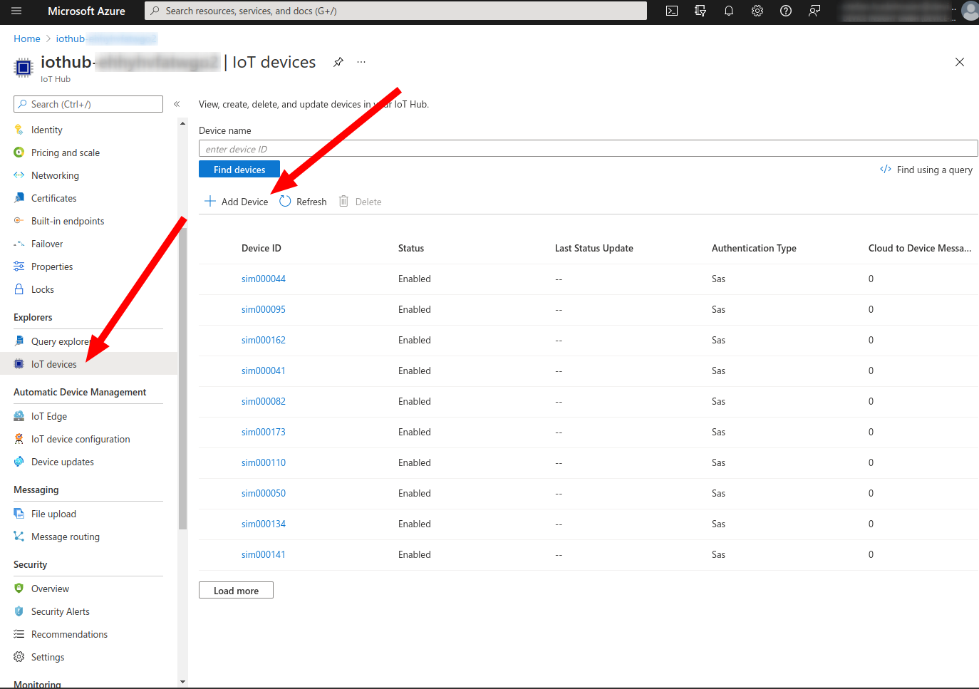 If you do not already have an IoT devices sending data, you can easily simulate one. First, create a device with device ID simulated-device in the IoT Hub: